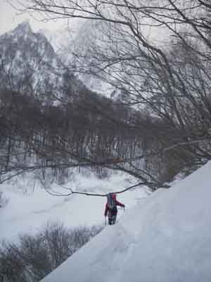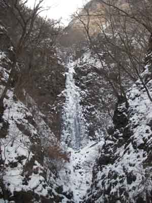 2/22 08:39 金曜夜はベースプラザに着くまでに車が吹き溜りでスタックするほどの吹雪でした。 昨日は風が弱くなるのを待って10時にベースプラザ発の大ラッセル大会。幽ノ沢まで行 くつもりが5時間かかって一ノ倉尾根末端まででした。金曜夜に雪が降るまではかなり雪が 少なかったらしく、山の斜面の積雪は1〜2m位です。林道は半分位出ていますが吹き溜まり で腰ラッセルになっている所も多いです。 ヘッ電を点けて指導センターまで戻り、指導センター脇で山下考案の底無しツェルト のテストビバークをしましたが、底が無いだけに底冷えして夜半に撤収しベースプラザに戻りました。 今日は朝から快晴でスキー客が詰め掛けています。 昨日のラッセル疲れもあり、今日はラッセルをする気にならず、不動滝へ移動中。 不動滝がダメな時は六合村のアイスエクストリーム「クニ」に行く予定です。 2/22 15:30 不動滝はベルグラに毛の生えた様な状態で水が流れていました。 六合村は日向の気温が12℃もあり、アイスエクストリームも大分氷が落ちてしまい、 北側でも水がしたたり休業でした。 仕方がないので、尻焼き温泉の河原野天風呂に入りソバを食べて帰ろうとしたら氷柱発見! 世立の白糸の滝が氷っているのが遠望できました。登っている人も見えましたが、 もはや着替えて帰宅モードに入っていたので取り付きまでの道を探したりせずに帰ってきました。 間もなく渋川伊香保ICです。 【山下】 |