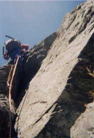 ると、すでにかなりたくさんの数のパーティがあちこちに取り付いているのが見える。 やっぱり出遅れたな〜と反省。Dガリーは石がしょっちゅう飛んでくる。ぼーっとしている場合ではない。 5尾根支稜にまわりこむ。 5尾根支稜 ●1P目 (20m、V)広いバンド ●2P目 (40m、V)カンテ 先行パーティがロープをつけて登っていたが、落石の心配もそんなにはなさそうだったし、少しでも 早く行きたかったので、ロープをつけずに登って先行パーティを追い越す。 下部フランケの取り付きが わかりにくい。鈴木の持っている最新版のルート図と白根さんの持っているルート図がかなり違っている こともあって、2人で壁を見ながら談義する。 結局、3パーティくらい溜まっているあたりが取り付きであると判明する。すでに前に3パーティ。 それでも、Dガリー側から上ってきたパーティのほとんどは右にトラバースしていったから、4尾根は さぞ大渋滞に違いない。 下部フランケ取り付きに8:00頃到着する。前のパーティのうち1パーティが、 「待ち」を避けて、下部フランケの左側からトラバースで3P目くらいに回り込もうとしている。我々も どうしようかと思ったが、それだと結局核心のあたりをパスしてしまって、おもしろくないのではないか ということで、地道に待つことにする。すぐ前のパーティが、自分達は遅いから先にどうぞと言ってくれ たが。こちらのパーティも決して速いとはいえないので遠慮させていただく。 結局2時間近く待つことになった。 下部フランケ ●1P目 白根(X− A1 (Y))スラブをリス沿いに登り、バンドを右へ フリーではYというだけあって、下から見ても傾斜があるわりにホールドがなさそう。最初のパーティのトップはA0で登っ ていったが、セカンドはアブミのかけかえ。次のパーティは2人ともアブミをかけかえて上っていく。 白根さんは1手あぶみを出して登っていく。ロープを上まで伸ばすこともできたが、先行パーティの時間 がかかっているため、短く切ることにする。 鈴木はアブミの用意をしたが、人工のあとではフリーが悪く 感じてしまうので、できるだけアブミは使いたくない。何故か残置(?)アブミがかかっていることだし 、セカンドなのでとりあえずA0で行こうと決めて、アブミを小さくたたんで邪魔にならない後ろ側にし まって登り始める。スタンスはかろうじてあるけど、ホールドが無い。 トップのかけてくれたヌンチャクをありがたく使ってA0でなんとか細い バンドに立つ。とりあえず、白根さんが残置(?)したアブミをまず 回収。ホールドの無いバンドを一歩右に出てしまえばあとは比較的楽な フェースだ。しっかりしたスタンスが右に見えるが結構遠い。ホールド がとても悪いし、傾斜も結構あるので、足を広げすぎると体重の移動が 難しくてバランスを崩しそうな気がする。前のパーティがアブミのかけ かえでずっと行った気持ちがちょっとわかる。じりじりとできるだけ右 によってから右足を出し、ゆっくりと右に乗り移ってほっと一息。が、 しかし左の上方にカラビナとロープが・・・。これを回収しに行かなくて はならない。(せっかく後は楽なフェースのはずだったのに・・・。)と 心の中でつぶやきながらいったん上に登って草付のバンドを左へトラバ ースしてなんとか回収。もう1本のシュリンゲは残置した(これはまあこの場合許されますよね、白根さん) 再び草付のバンドを右へ戻って1P目終了。 ●2P目 鈴木(15m、W)凹角 前のパーティが2人ともアブミのかけかえで登っていく。そんなに厳しいのだろうか。Wなのでとりあえ ずフリーで登ることにする。出だしからいきなり厳しい。滑り落ちそうなクラックなのだが、支点が無い。 奥のほうに残置フレンズが見えるが奥過ぎて届かない。たしかにフレンズが欲しいところ。お助けシュリン ゲがあるが、ちょっとがんばってみることにする。「とりあえず、そのシュリンゲでランニングを取って」 と白根さんに言われてそれもそうだと思いとりあえず取る。覚悟を決めて立ち上がる。上の支点でランニング を取ったときは思い切りほっとした。ほっとしたのはビレイしている白根さんの方かも知れない。その上は 小さなクラックを登って上のバンドに出る。ロープには余裕があるが、先行パーティがいたので、そこで切る ことにする(実は一休みしたかったので先行パーティがいてほっとした)。 ●3P目 白根(W+ 20m)V字型のコーナー 凹角のクラックのルート。前のパーティはやはりアブミのかけかえで登っている。たしかに支点の間隔は 結構近いので、人工に向いているのかな。足が痛いのでなるべく両側のフェースにスタンスを探すが、あまり 見つからず、仕方なくクラックに入れて登る。ホールドは悪い。トップも鈴木も1手A0を使う。足の痛さに うんざりしてきた頃にようやくクラックを抜けることができる。 ●4P目 鈴木/白根(W+ 40m)V字凹角〜ハングを左に出、クラックを左上 クラックから左へハングを回り込んでフェ