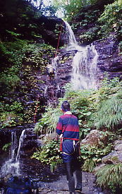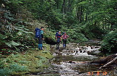 いたるところで尺岩魚が泳いでいるのが見える。 ブナ林を堪能しながら11時ころ河原でそうめんをゆでる。美味い。わさびに七味、おまけに海苔 まで持ってきてくれた池崎さんに感謝。腹一杯食べて空を見るとパラパラ小雨が降ってきた。1時 ころ遡行再開し、まもなくヨドメの滝の大釜に到着。ザイルを出してかぶり気味の左壁を登る。 取付きで少々てこずるがあとはバンドを登りどうということはない。滝の上は大きな淵があり、 左岸に上がって林の中を歩く。10分程で完璧に整地された幕営地を見つけ16時30分設営を 開始する。パラパラ来ていた雨も上がり夕食はカレーライス。 薮蚊が多いのは気になるが早めに寝る。