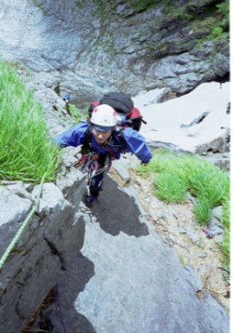 しまった雪渓に泥がついており、滑りやすく歩きづらいというほどではなかった。 9日の天気は、曇りのち晴れ。夜中に大雨が降ったので、一時はどうなるかと思ったが、なんとかもってくれた。 鈴木さん鎌田さんパーティーは中央稜にいくということで、テールリッジ末端付近で分かれ、我々は予定通り南稜に向かった。 南稜テラスには、先頭で到着。渋滞することはなかった。 1ピッチ目のルンゼは、ルートが右にそれ、さらに上部でチムニーになる。1ピッチでチムニーまでいけるが、 ロープの流れが悪くなることを避ける為に、先生はチムニーに入る前で短く切った。チムニーは、岩も乾いていて、 三つ峠の権兵衛チムニーよりは登りやすかった。3ピッチ目は烏帽子スラブを登るが、正直に言うとこの辺はあまり記憶に残ってない。 4ピッチ目の草つきのルートを私がリードさせてもらった。アンカーがうまく作れず、セカンドのロープを引っ張りあげるのがうまくいかなかった。 さらに、5ピッチ目は、先生のリードで、正面のかぶり気味の岩壁を左から巻く。声があまり届かず、先生が「ビレイ解除!!」と言っているのに、 自分は「あと5m!」などと言っている始末。(笑)と後から聞きました。6ピッチ目は、緊張感ある馬ノ背リッジに出る。 左右切れ落ちているので、慎重に登る。最後のピッチは、核心の垂壁に突き当たり、うれしいリードをさせてもらった! 一番面白いピッチのリードを譲ってもらった先生に感謝。ハーケンがたくさん打ってあり、ホールドとスタンスをよく探していけば、 なんとかなる。先生からツインロープでいくように指示があったが、うまく出来なかった。
