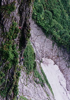 覚えていないし、鎌田さんも初めて。最近ルートが変わったという話もあり、とりあえず下から眺める。 さて、と思ったが2人ともお手洗いタイムになってしまう。下から続々と人が上がってくるので良い 場所が無く、結局人がとぎれるまで待ったために取り付き時間がかなり遅くなってしまう。 南稜の方を見るともう山下・長田組は壁の途中だ。私たちの後に上がってきたパーティの方が先に 支度ができてしまったので先を譲ろうかとも思ったけど、結局彼らは他のパーティとロープ交換などを していたので、先に上がらせてもらう。7:20登攀開始。 1P目(40m W) 「凹角から逆層のフェースを乗越す」鎌田さんのリード。岩もほぼ乾いていて快調。 2P目(40m W+〜X?) 鈴木リード。「日本の岩場」によると2P目『泥のルンゼU』〜3P目 『カンテを右に回りこみ凹角−フェースV、A0』だが、2P目の途中から烏帽子沢奥壁側のフェースに まわりこみ、そのまま大きく巻いて3P目の終了点の5m〜10mくらい下まで切らずに登る。トポのルート とは違うことには気づいていたが、最近2P目がかわったという話だし、支点も問題なく続いているので、 泥のついた草付よりは乾いたフェースの方が快適そうだと思い、フェースに回り込んだ。まわりこむところ でちょっと傾斜があって、逆層で岩が細かく厳しい感じがしたが、岩が乾いていたおかげで無事越える。