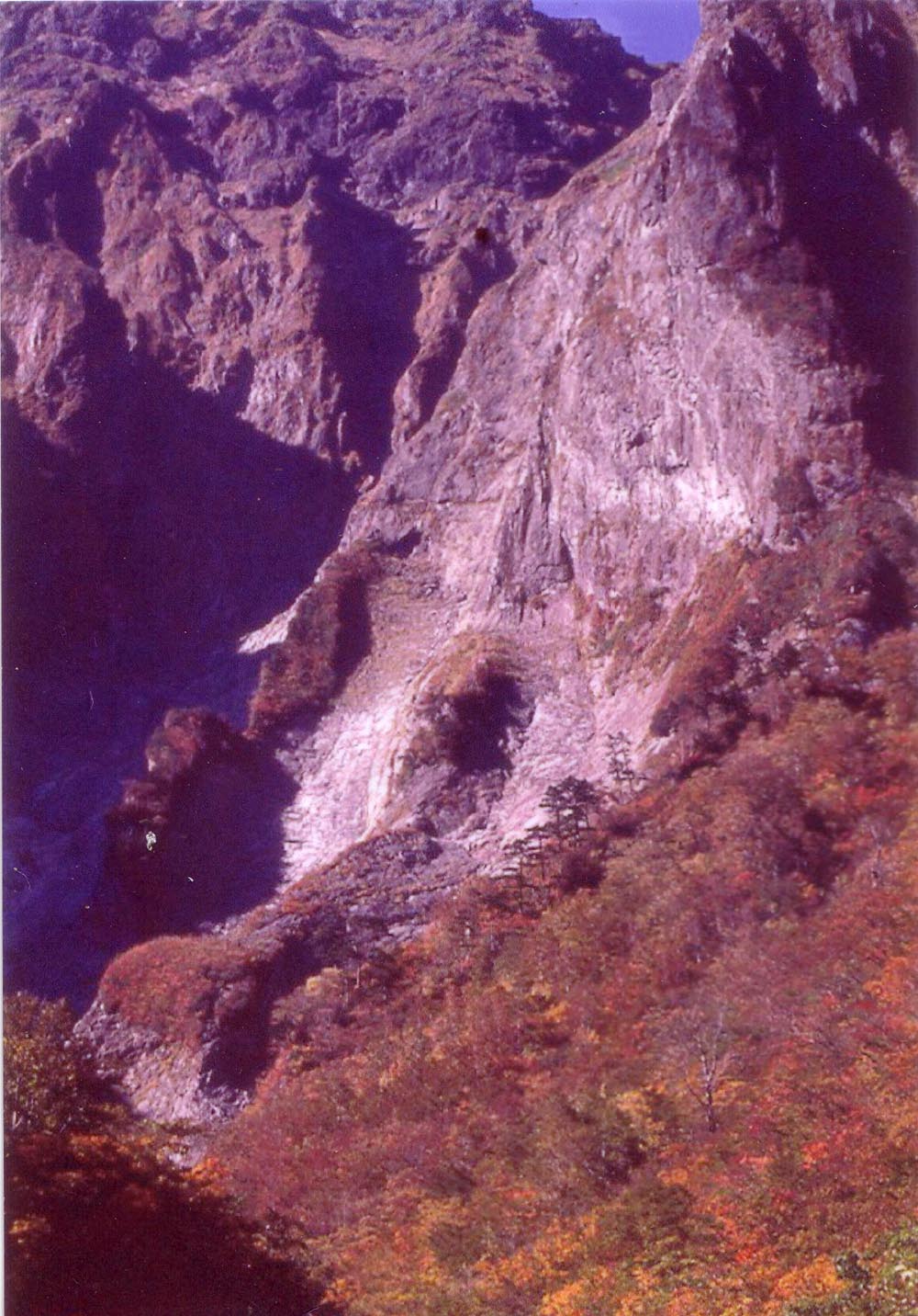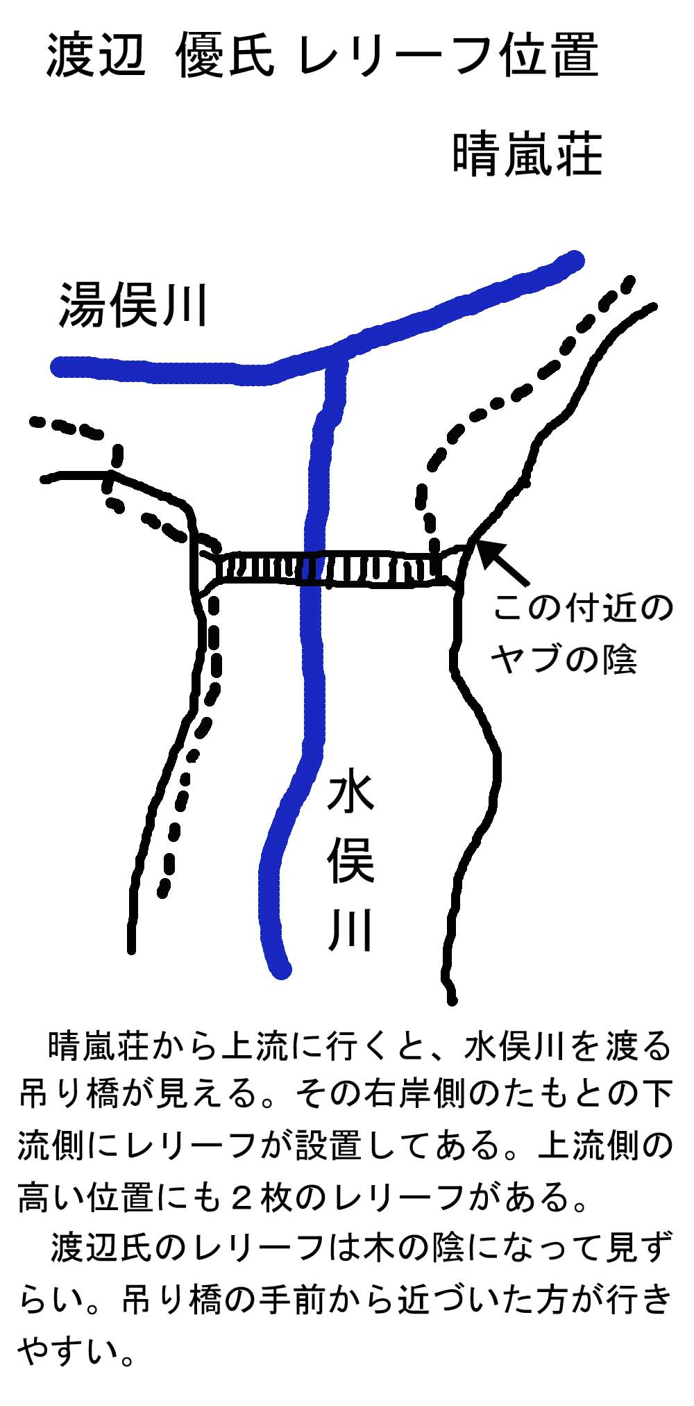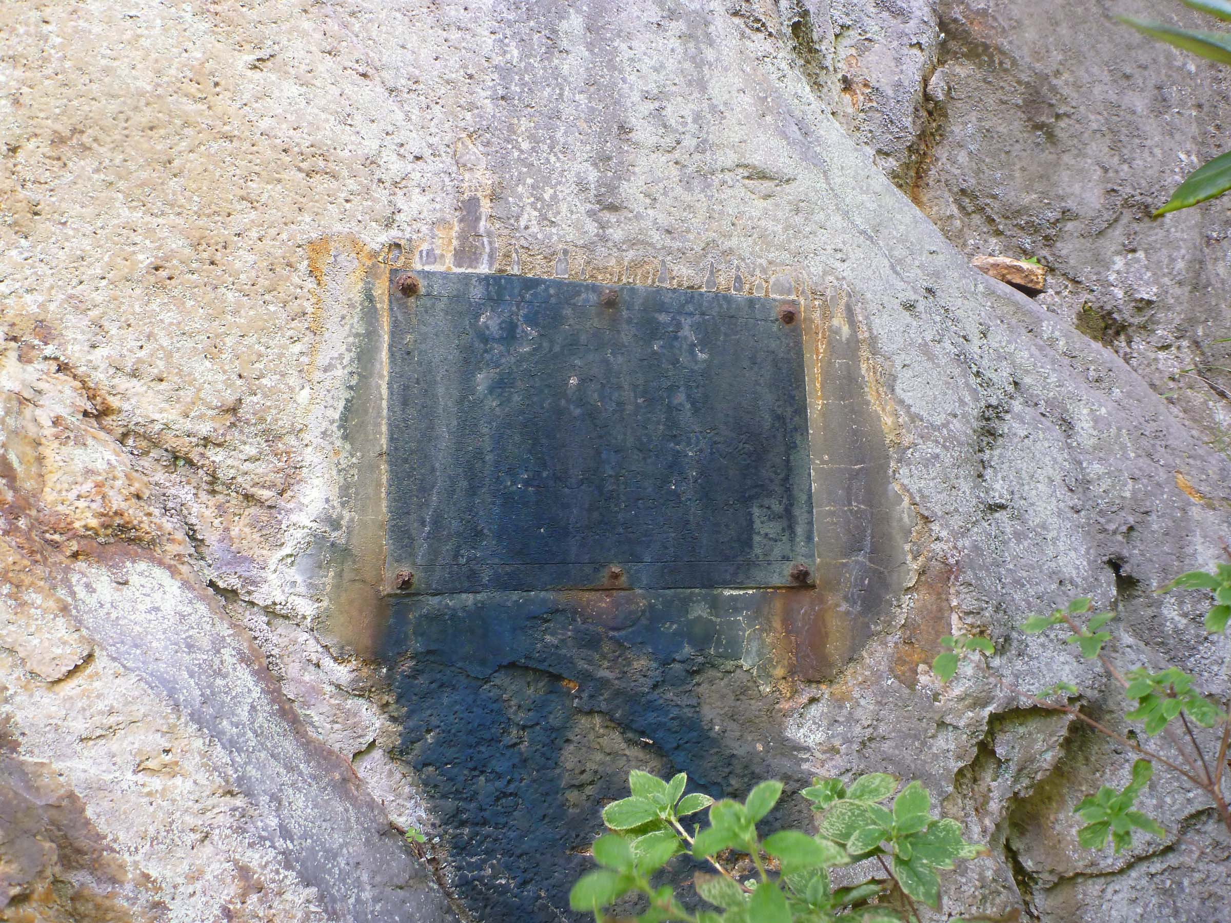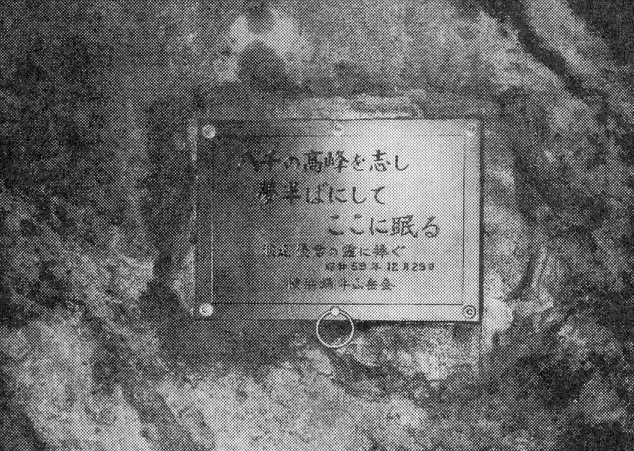 昔、和田さんと北鎌尾根に行ったときに渡辺氏のレリーフは見ているので、大体の場所は憶えていました。上記地図を参照 して下さい。しかし、当時もだいぶ硫化水素で腐食されていたが、今回はかなり腐食が進んでいました。【写真@】は50周年記 念誌から複写した渡辺氏のレリーフで「八千の高峰を志し 夢半ばにして ここに眠る」という碑文が書かれています。 今回、見つけてすぐが【写真A】です。表面は黒くなって全く読めない状態でした。タワシでこすってサビを落としたら、何とな く碑文が読めるようにはなりました。【写真B】 N 36°23' 45.0" E 137°40' 42.9"