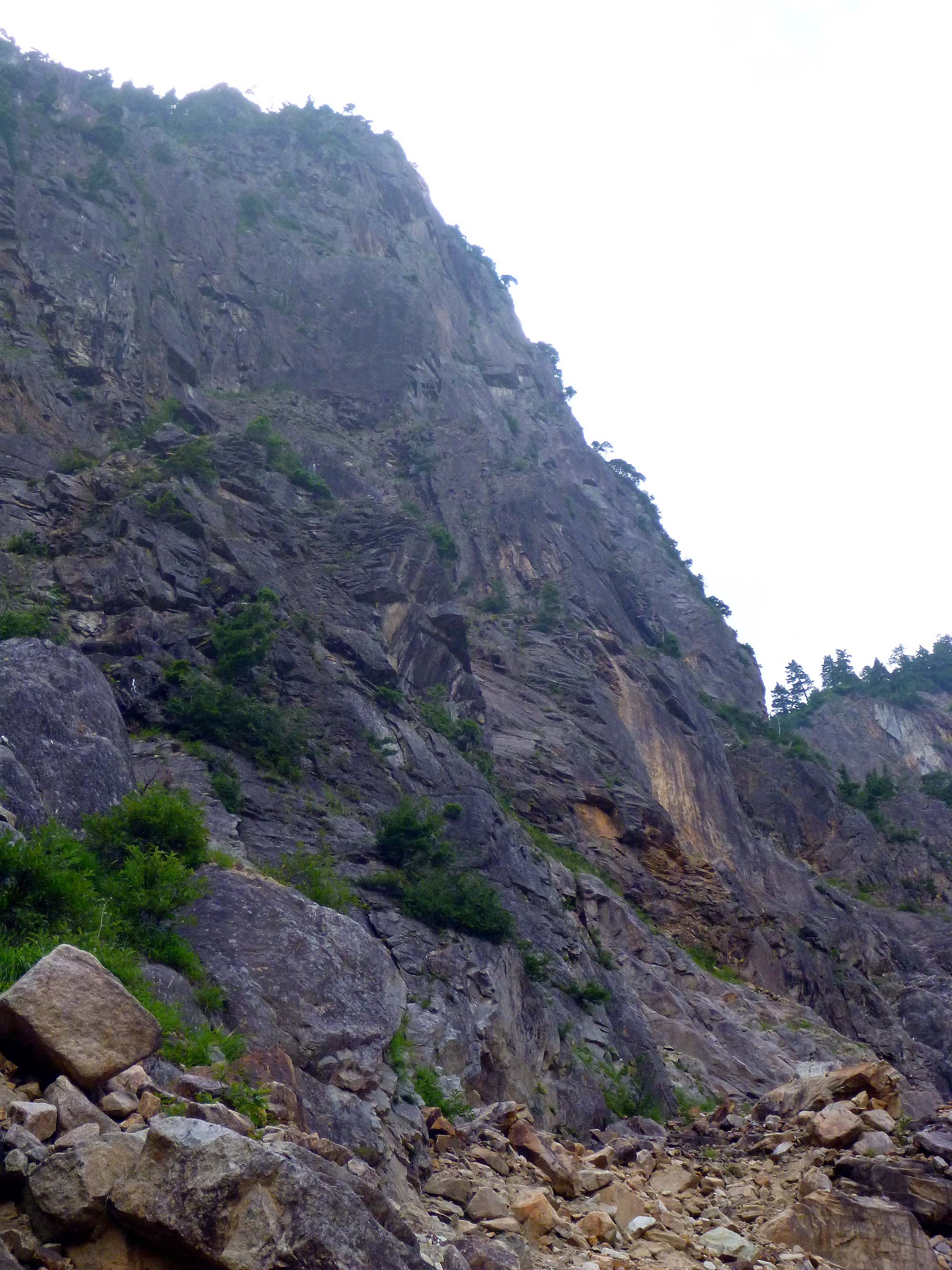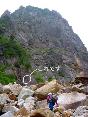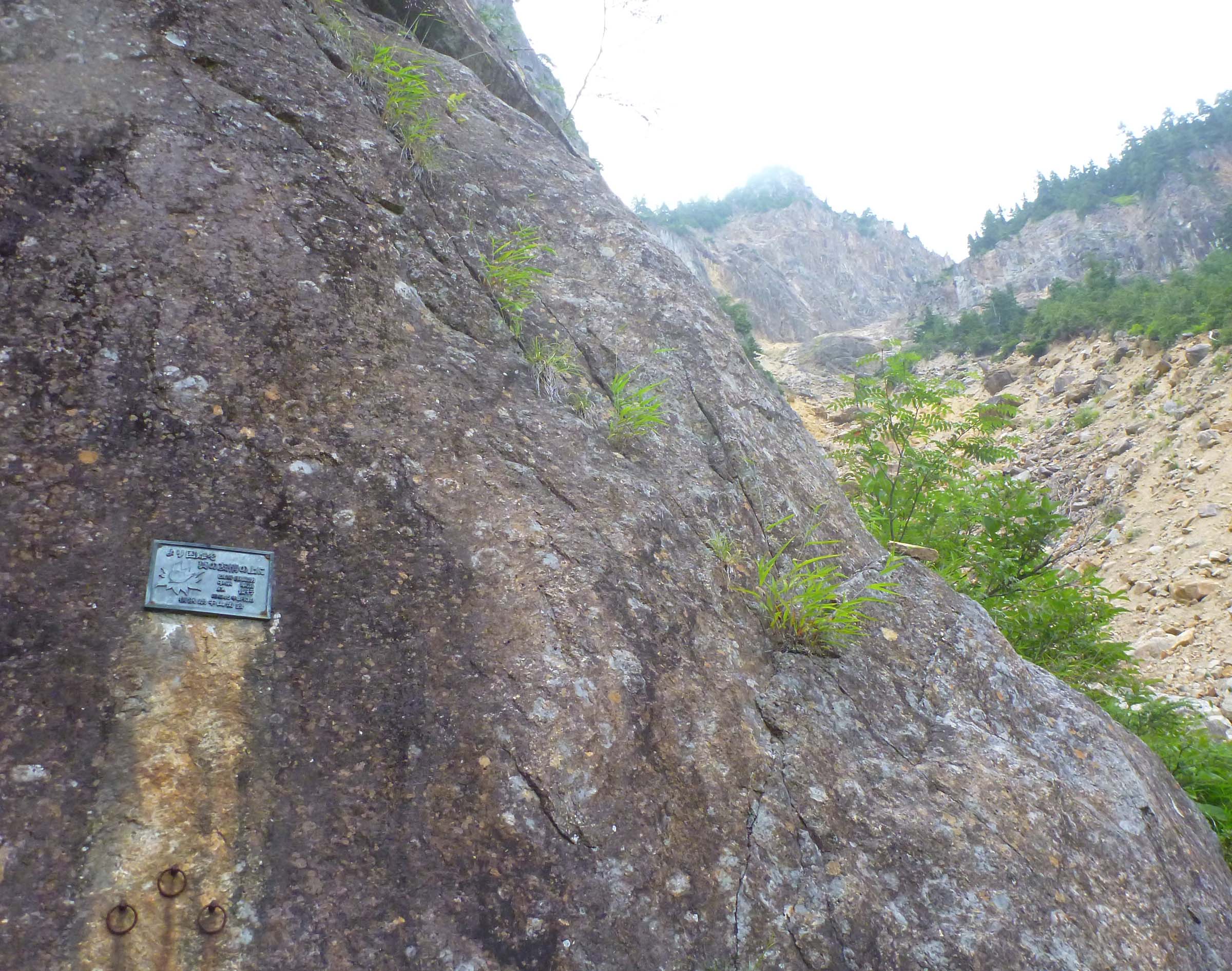 ルンゼをハーハー言いながら登って行きます。かなり大きな岩もあって、安定していない岩場である事を示しています。 ルンゼが少し右に曲がり岩壁基部が見えるようになると、遠くからでも緑色に変色したレリーフがすぐ分かります。 右岸の少し高い所の東向きに取り付けられたレリーフは大変きれいな状態でした。