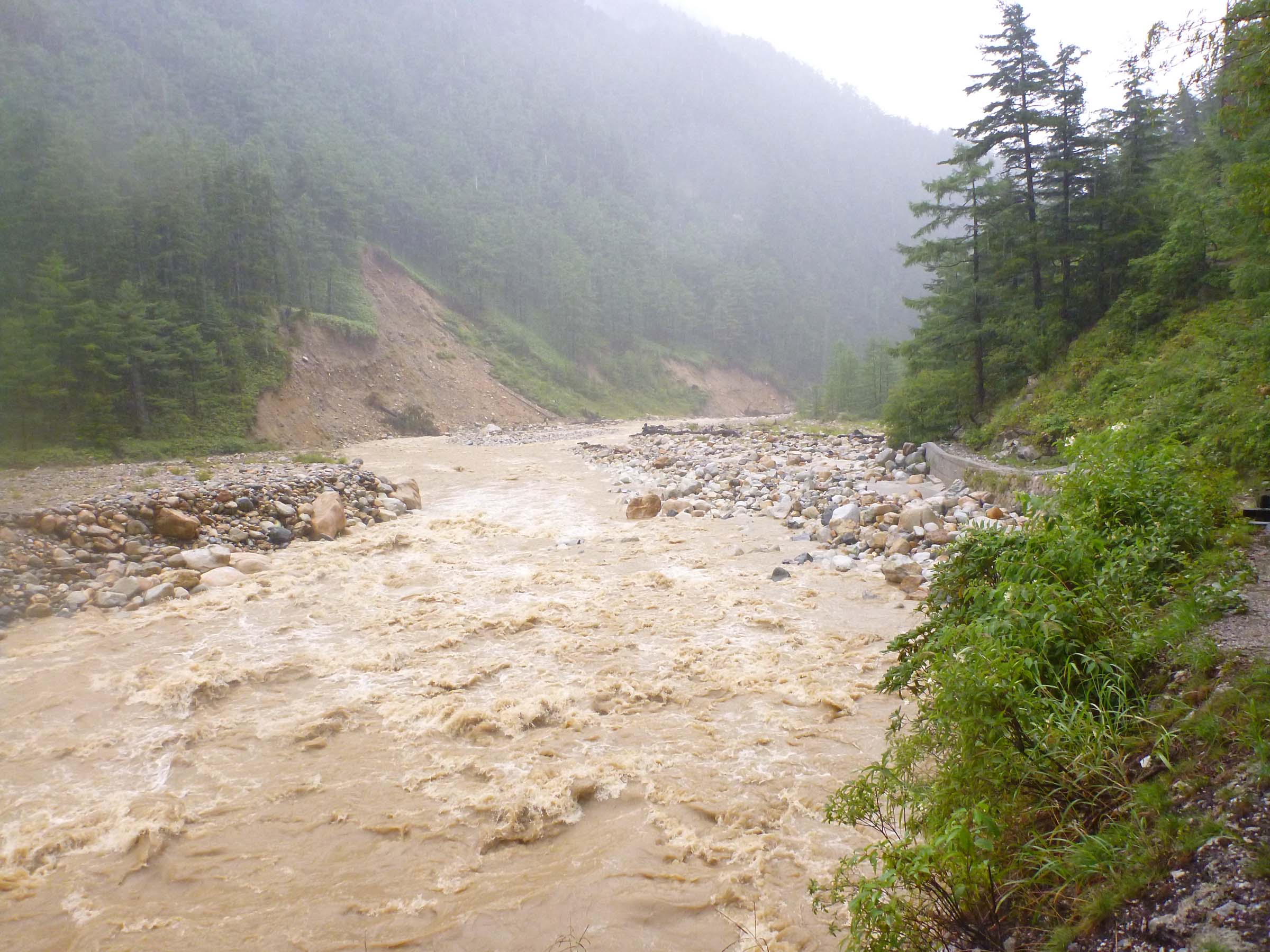 そこから吊り橋を渡って水俣川左岸へ。昔はここから登山道が千天出合いまで続いていたのだが、踏み跡をたどって50mも行くと崩れて無くなっていました。 へんにトラバースするのも危険なので、水俣川に降り遡行する事にしました。結構水量があって渡渉が大変で、クワウンナイ川くらいの手応えです。 何度か渡渉を繰り返し、硫黄岳前衛峰の取付に上がるガレルンゼに出ました。水はほとんど流れていません。