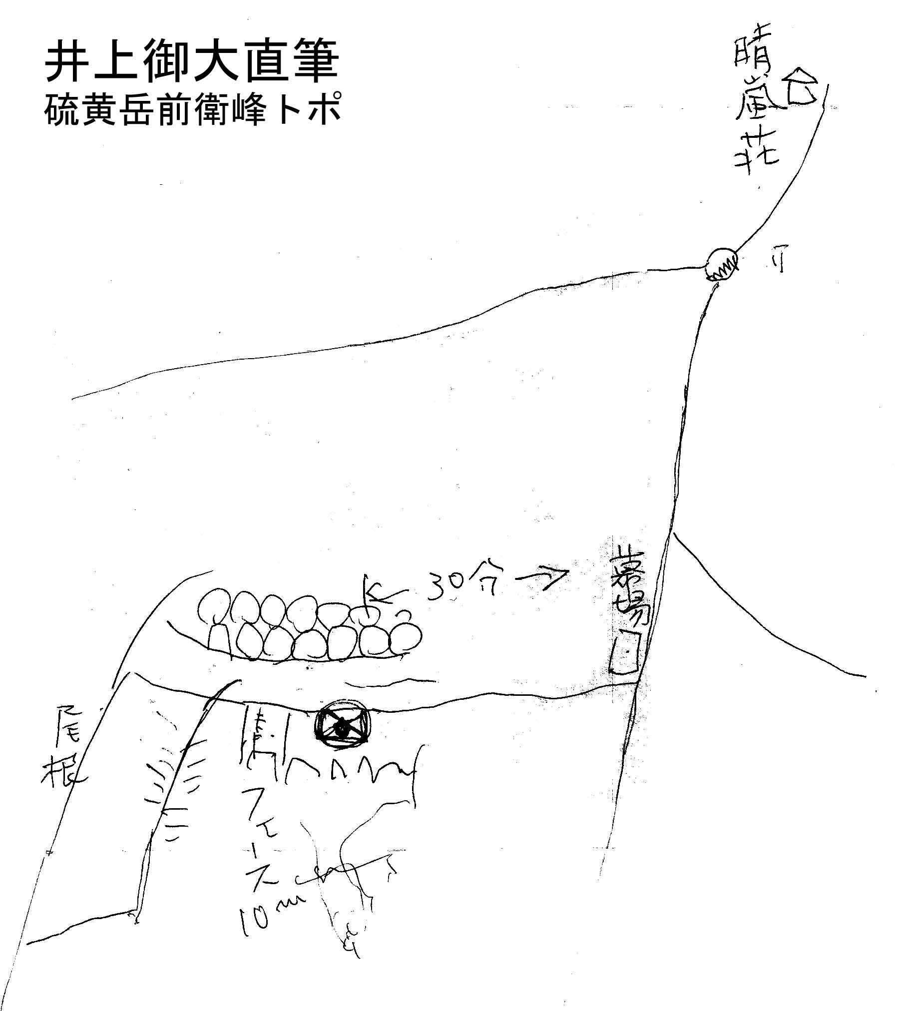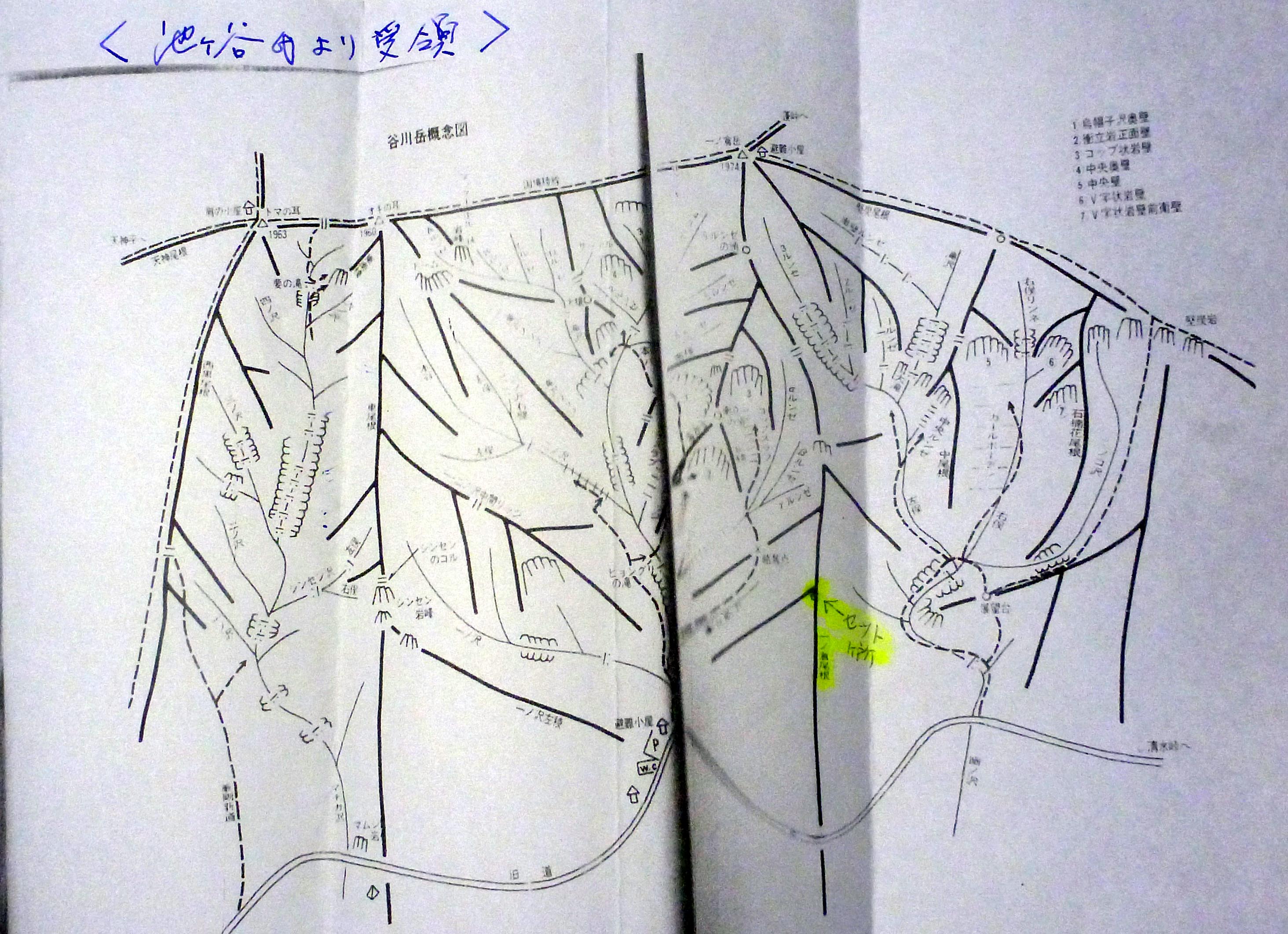 今回は山行のついでと気楽に行ける場所ではないので、御大直々に概念図を書いてもらい万全の準備で入りました。 「湯俣の出合いから遡行して、水俣沢右岸に大きな支流(中東沢)があり、そこから少し上流に左岸から土砂の押し出しのあるルンゼが入っている。 出合いには幕が張れるくらいの平地があった。急なルンゼを30分も登ると右岸フェースにレリーフがある。さらに奥に行きリッジを越えれば前衛峰フェース」 との事でした。