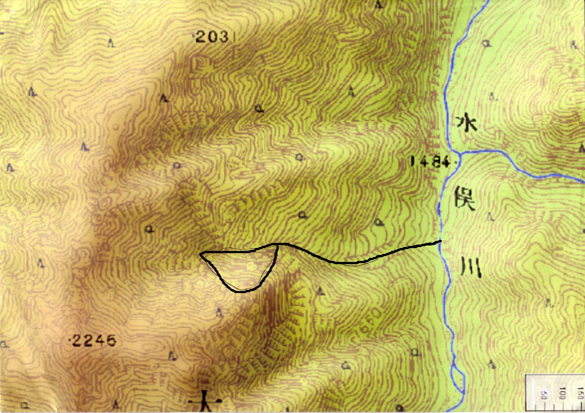 池ヶ谷さんの概念図も衝立前沢と衝立前々沢の間の尾根なので、設置点は今回の到達点よりもっと高いところと思われる。 今回は藪の部分を少し刈り払いしたので、次回はさらに高いところまで行く事として今回の捜索を終了する。 後日、和田さんと会って話をしたら、和田さんはコップスラブがすぐそこに見える所まで行ったが見つからなかったとのことであった。 また、他の二枚のプレートと一緒に速乾性セメントで岩に貼り付けてあるらしいという情報を新たに得る事が出来た。 |