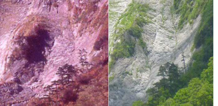 6月5日(金)夜行〜7日(日)で谷川岳に新人の増子を連れて入りました。6日は南稜を登る予定で一ノ倉出合いまで行きましたがあいにくの雨。 仕方がないので渋川の近くにある子持山の獅子岩に行きました。 7日に山下は所用があり夕方までに家に帰らなくてはならないので、新人の増子を津田・山本・鈴木に預けて山下が単独で一ノ倉尾根にレリーフの捜索に入りました。 GPSのログは下記の通りです。 ![]() ポイント[583]が上の送電線鉄塔なので、そこまではしっかり刈り払いがされていました。 しかし、そこから上は場所によって踏み跡はあるものの、結構な藪漕ぎになっていました。 鎌を持って行っていたので、少し刈り払いをしながら上がりました。藪の中で尾根にじゃまされ衝立岩は見えません。 1100mの所まで来ると小ピークとなり、衝立岩が正面に望めます。【写真@】 松川さんの写真と比べると、烏帽子スラブがよく見えない。どうやらもう少し南側から撮影した写真の様です。 この小ピークからは一ノ倉沢出合いに向かって、結構大きな木が生えた支尾根が出ています。そこで支尾根の方に少し移動して見ました。 ポイント[580]からは衝立岩やコップスラブが木にじゃまされないで良く見えます。【写真A】 しかし、この位置でも松川さんの写真の方がもう少し南側の下です。さらに少し下がってポイント[581]から撮影してみました。【写真B】
