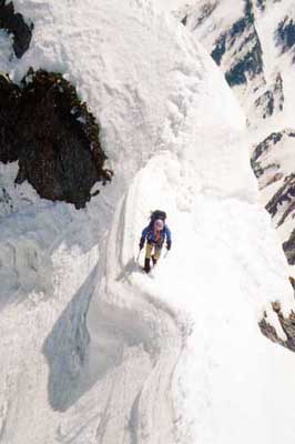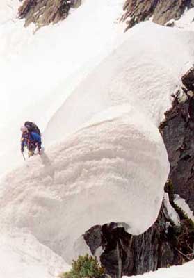 | Y峰の登りの途中にこん なデカイ雪庇が…。俺が 通る時だけ落ちないで。 |