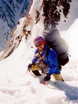 XYのコルからY峰へ。 急な雪壁を登り、頭に着 いてほっと一息。 |