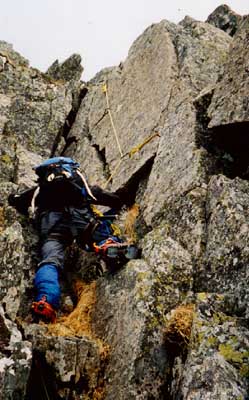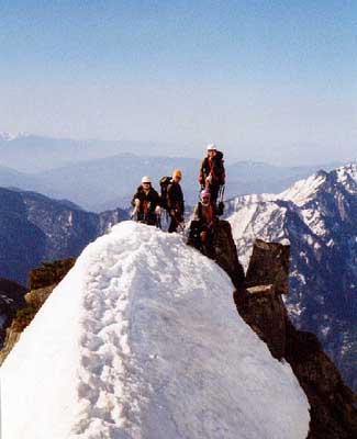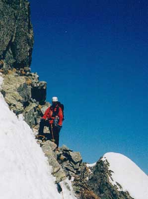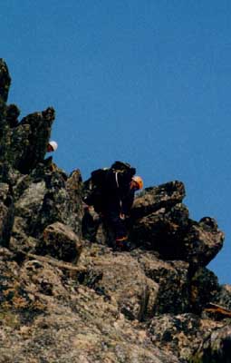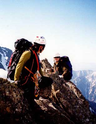 トリコニーが終わり高度感 のあるピナクルのリッジで 撮影。青空が気持ち良い。 |