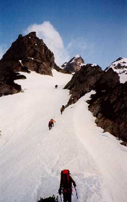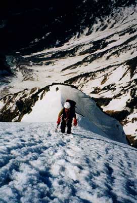 ツメの雪壁をひたすら登る 新人の津田。元陸上部なの でその足取りは確かです。 |