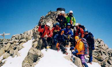 参加者10人全員が奥穂の山頂に集合。これから ジャンダルムを越えて岳沢ベースまで戻ります。 |
