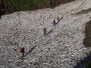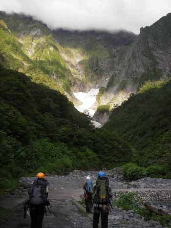 ![]() 一ノ沢出合付近から雪渓が 出てきますが、対岸の衝立前 沢下山路から見てもこんなに 下に見えます。 |