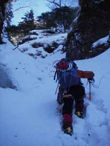 | 12月24日の広河原沢と言ったら「クリスマスルンゼ」です。まだまだ発達途中ですが何とか登れます。 計画ではここでアイスクライミングの練習をしてから南稜に上がる予定だったのですが、手前でイロイロあって時間を食ってしまったので割愛しました。 |