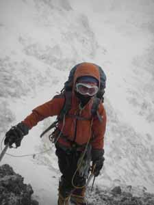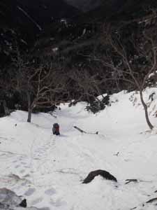 | クリスマスルンゼから先の広河原沢右俣はトレースも無く、スネからヒザ位のラッセルです。 | 上部に来ると雪が締まってくるのでラッセルは無くなりますが、傾斜が強くなって来るので緊張します。 |
