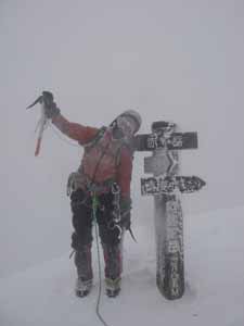 | P1下まで下って幕営した翌日は朝から吹雪。風も強くて冬山の厳しい面が経験出来ました。 | 全身真っ白になって阿弥陀岳山頂に到着です。他の登山者は誰もいません。これから長い御小屋尾根を下山です。 |