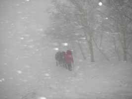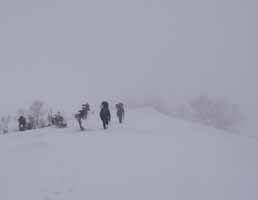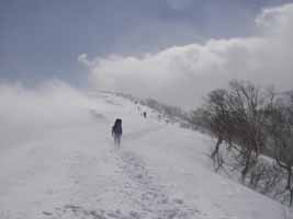 | 入山日は朝から雨。雨が止むのを待ってからテレキャビンで遠見尾根に上がりました。前線の通過直後なので稜線は風が強く、小遠見付近は地吹雪です。 |