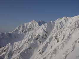 | 鹿島槍ヶ岳の北壁がきれいに見えています。「北壁主稜」は登りたいルートの一つです。今日なら最高のコンディションかな? |