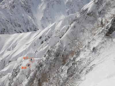 こちらはGU中央稜を登る津田・谷口組。取り付きはかなり下なので。登るのは時間がかかります。 |