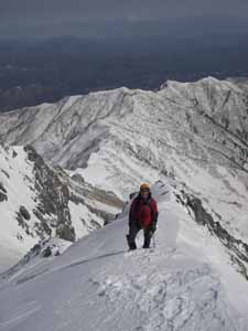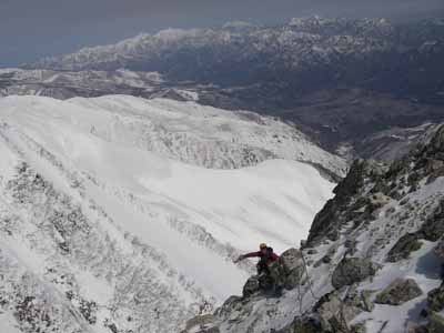 | G0稜を登る石綿・立石組。単なる雪壁・雪稜なので早いです。もうすぐ頭に抜けてしまいます。 |